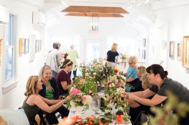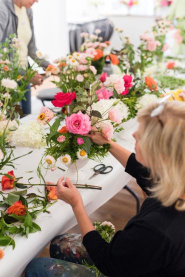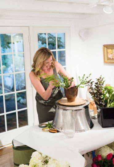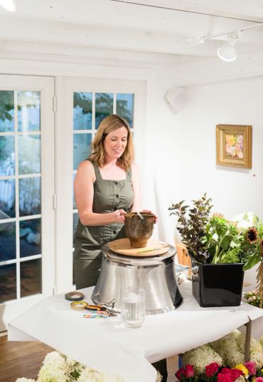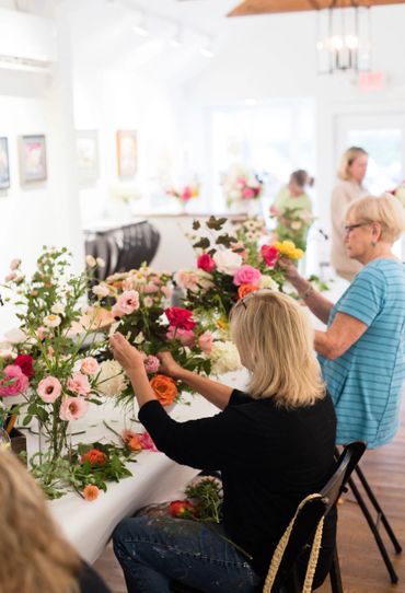 The workshop will begun explaining the basics of floral design, style, color, texture, form... and together we created a compote style centerpiece. Now the fun part!! When it is completed